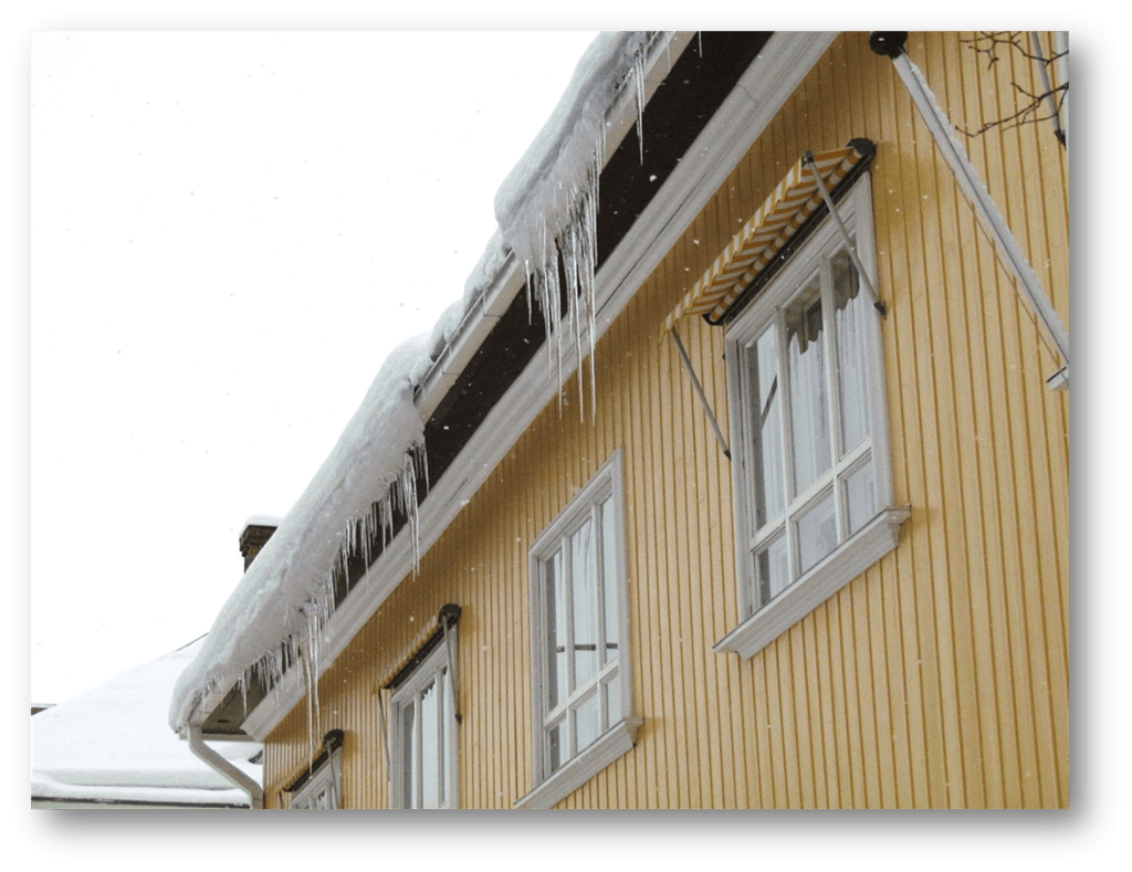 KUVA 1. Kerrostalon ullakolla olevat lämpövuodot lämmittävät ullakkoa merkittävän paljon. Seurauksena katolta alas tippuvaa lunta sekä runsaasti jääpuikkoja räystäällä. Näin etenkin, kun ulkolämpötila on hieman pakkasella tai plussan puolella.