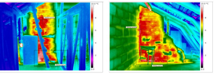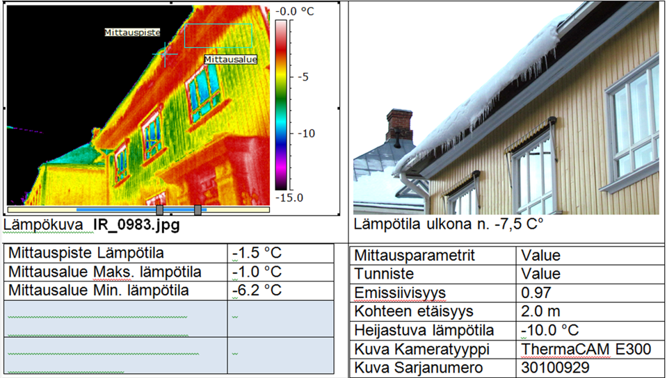 KUVAT 2. ja 3. Yläpohjan lämpövuodot näkyvät puikkoina, lumen/jään valumisena ja kohonneena räystään lämpötilana
